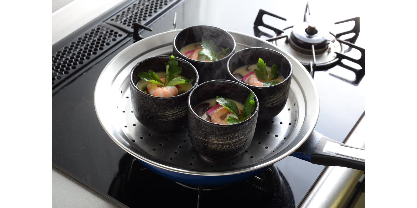 蒸し料理を作りたいけど、なんだか大変そうと思われる方もいらっしゃると思います。「炒める・煮る・茹でる」など多彩に使えるフライパンの上にのせるだけで、蒸し器としてご利用いただける便利なフライパンと蒸し器のセットです。